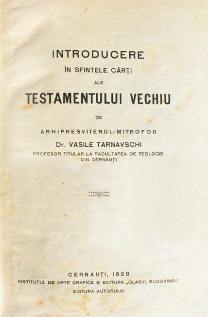 Introducere în Sfintele Cărţi ale Testamentului Vechiu, de Arhipresviterul-Mitrofor Dr. Vasile Tarnavschi, profesor titular la Facultatea de Teologie din Cernăuţi.