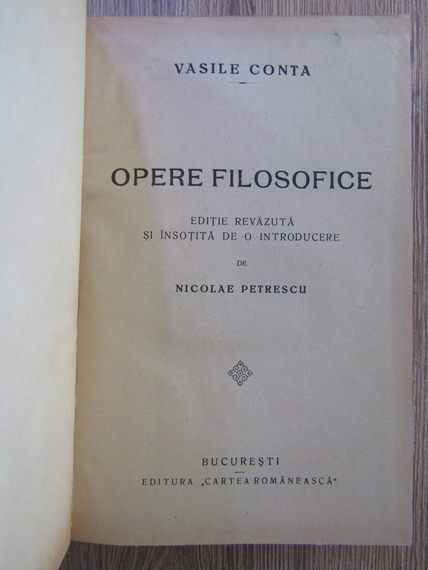 Editia I a volumului de Opere filosofice de Vasile Conta, aparuta la editura Cartea Romaneasca in 1922. Coperti cartonate cu legatura originala a editurii.